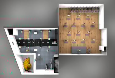 Un espace dynamique et modulable de 60m2, idéal pour les entrainements fonctionnels, le travail en circuit, l'haltérophilie ou les séances en petits groupes